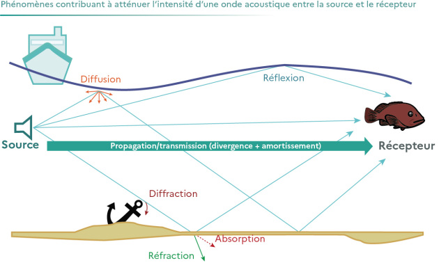 la nature du fond. Les sédiments ont, en fonction de leur nature, la capacité de réfléchir (ex. : roche) ou d’absorber (ex. : vase) les ondes sonores ;