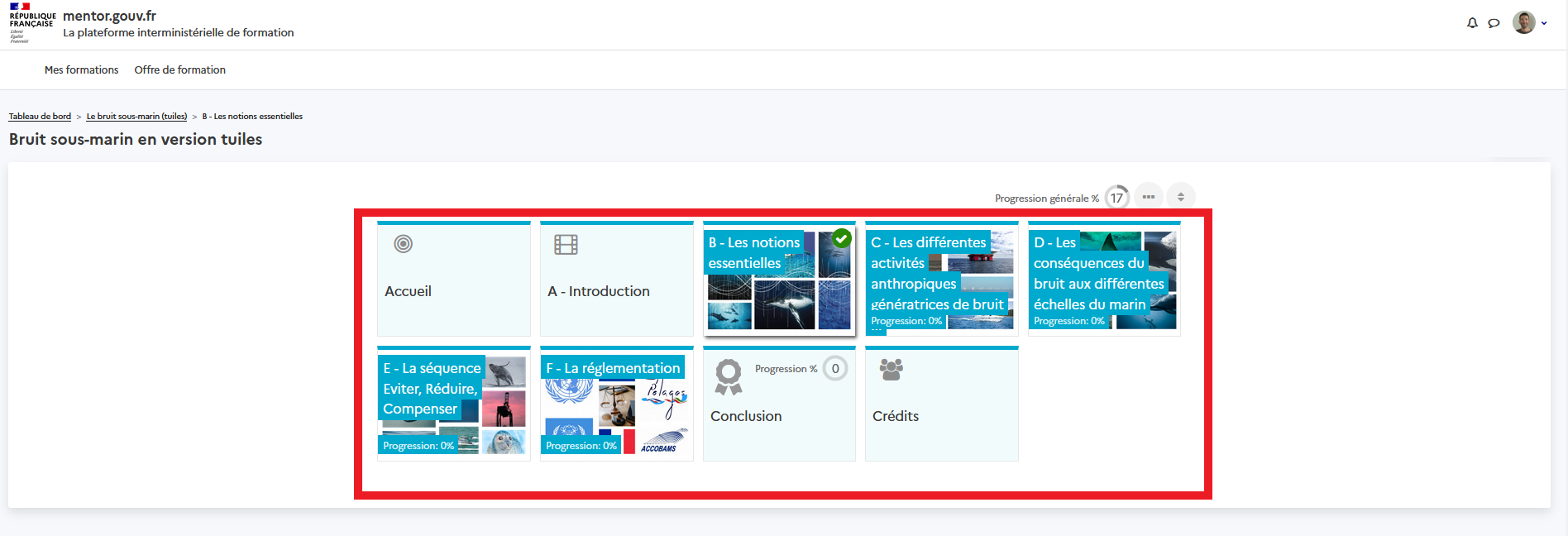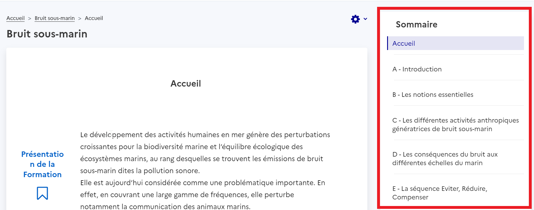 Le sommaire est présent dans la colonne latérale droite dans le gabarit thématique et dans la zone centrale dans le gabarit tuiles. Ses différentes sections peuvent comporter des contenus et des éléments liés au déroulement de la formation (présentation, aide, évaluation de la formation).
